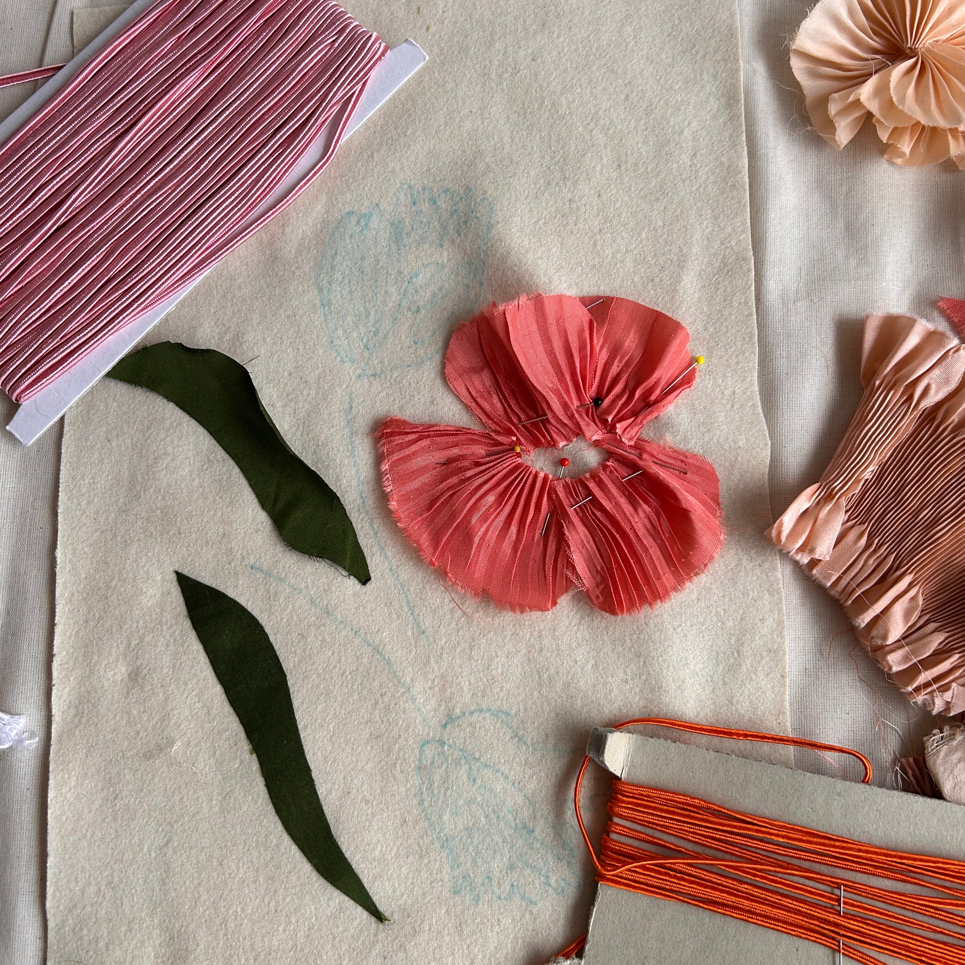 - Fabric manipulation techniques to create 3D pleated flowers