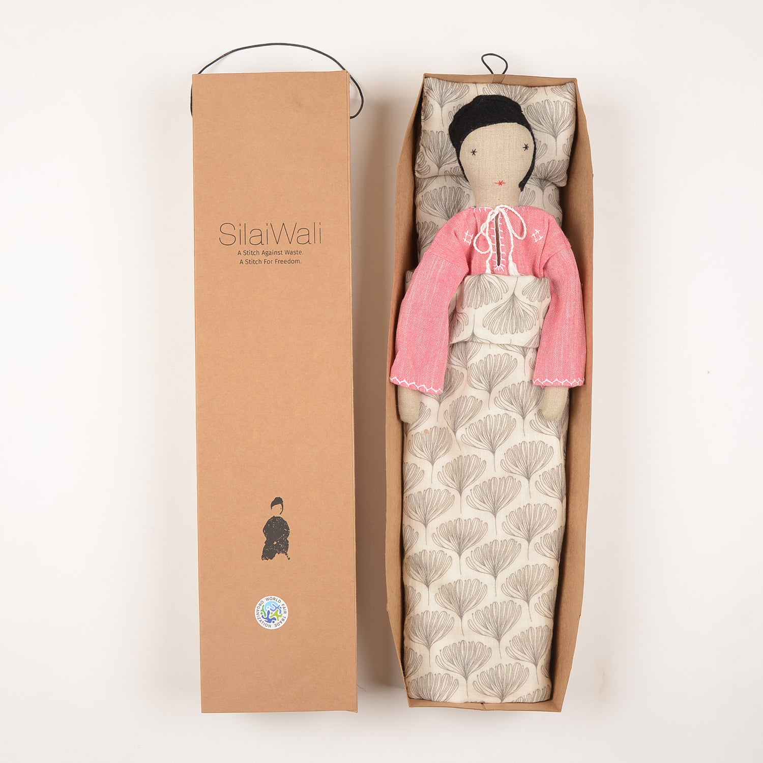 Materials: Cotton doll, polyfill filling, woollen hair, cotton bedding, paper box