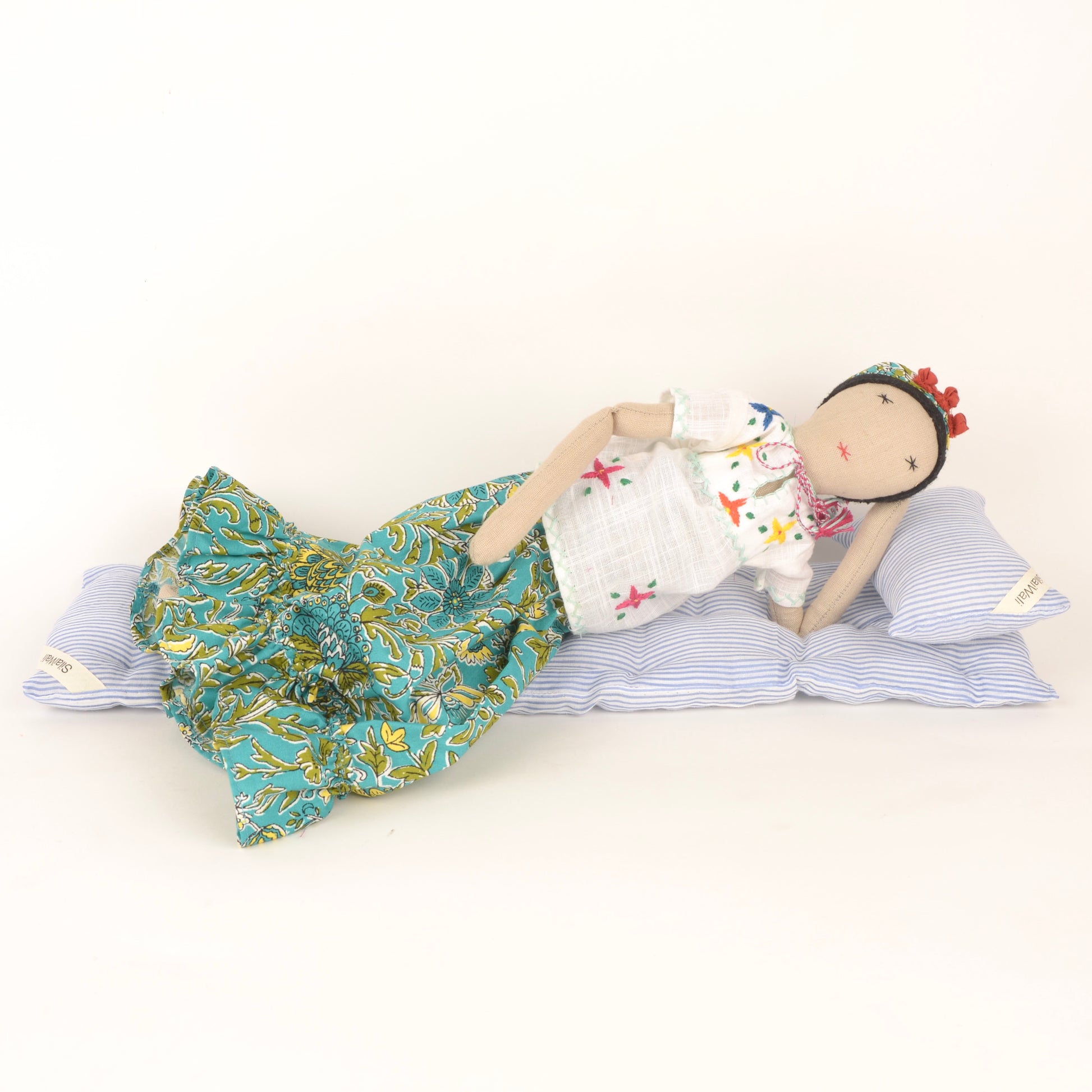 Frida bursts with colour, movement and joyful expression. Her embroidered skirt and vibrant patterns feel celebratory, carrying stories of hope and creative freedom. Each stitch reflects care, skill and the desire to bloom despite adversity.