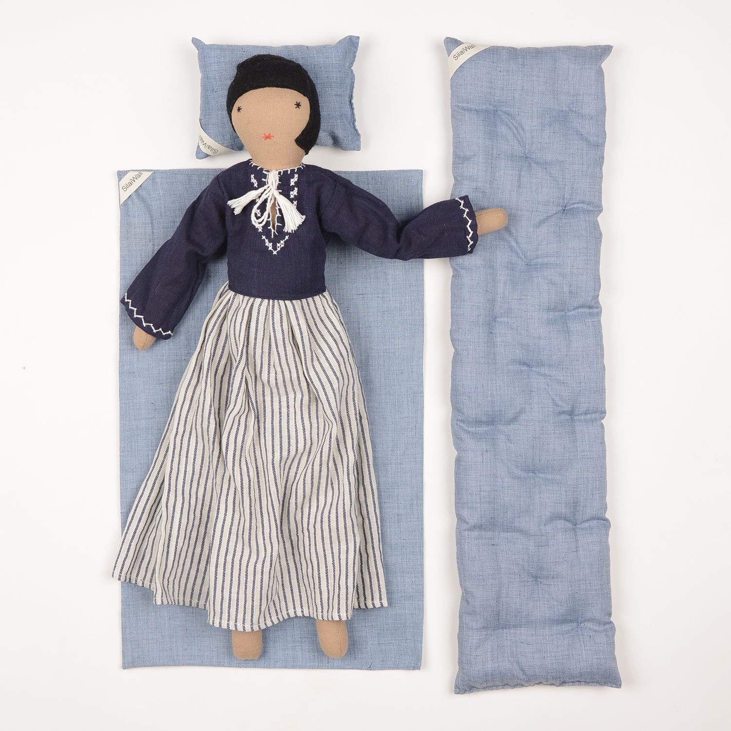 Maya carries a gentle sense of playfulness and quiet resilience. Dressed in a flowing skirt and long-sleeved blouse, her knotted neckline with a drawstring adds a light, whimsical detail to her silhouette. Once a forgotten fabric remnant, she has been carefully transformed by skilled Afghan women refugees into a figure full of warmth and character.