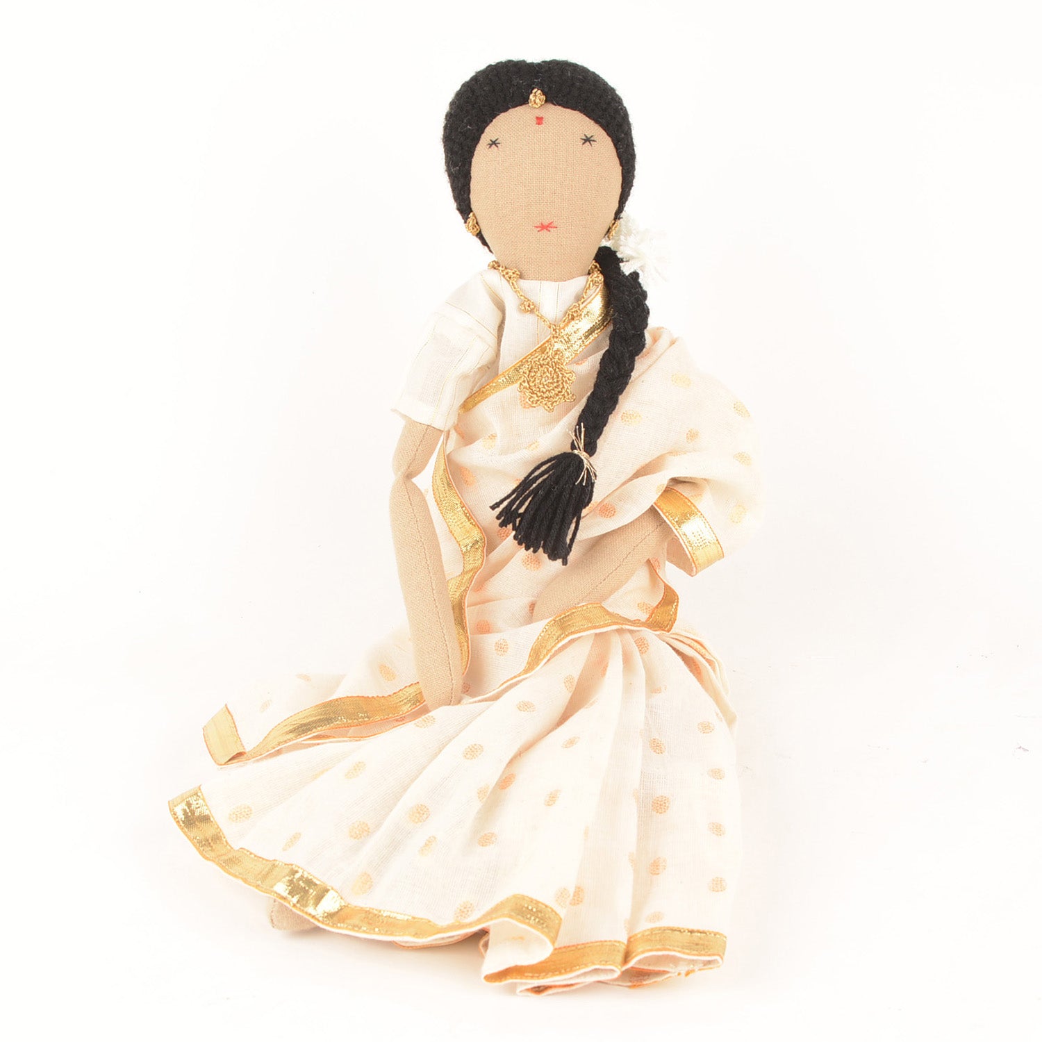 Viji radiates celebration and elegance inspired by Kerala, known as God’s Own Country. Dressed in an off-white sari with a gold border and adorned with ornate jewellery, she evokes festivity, beauty and joyful anticipation. Jasmine flowers woven into her braid complete her ceremonial presence.