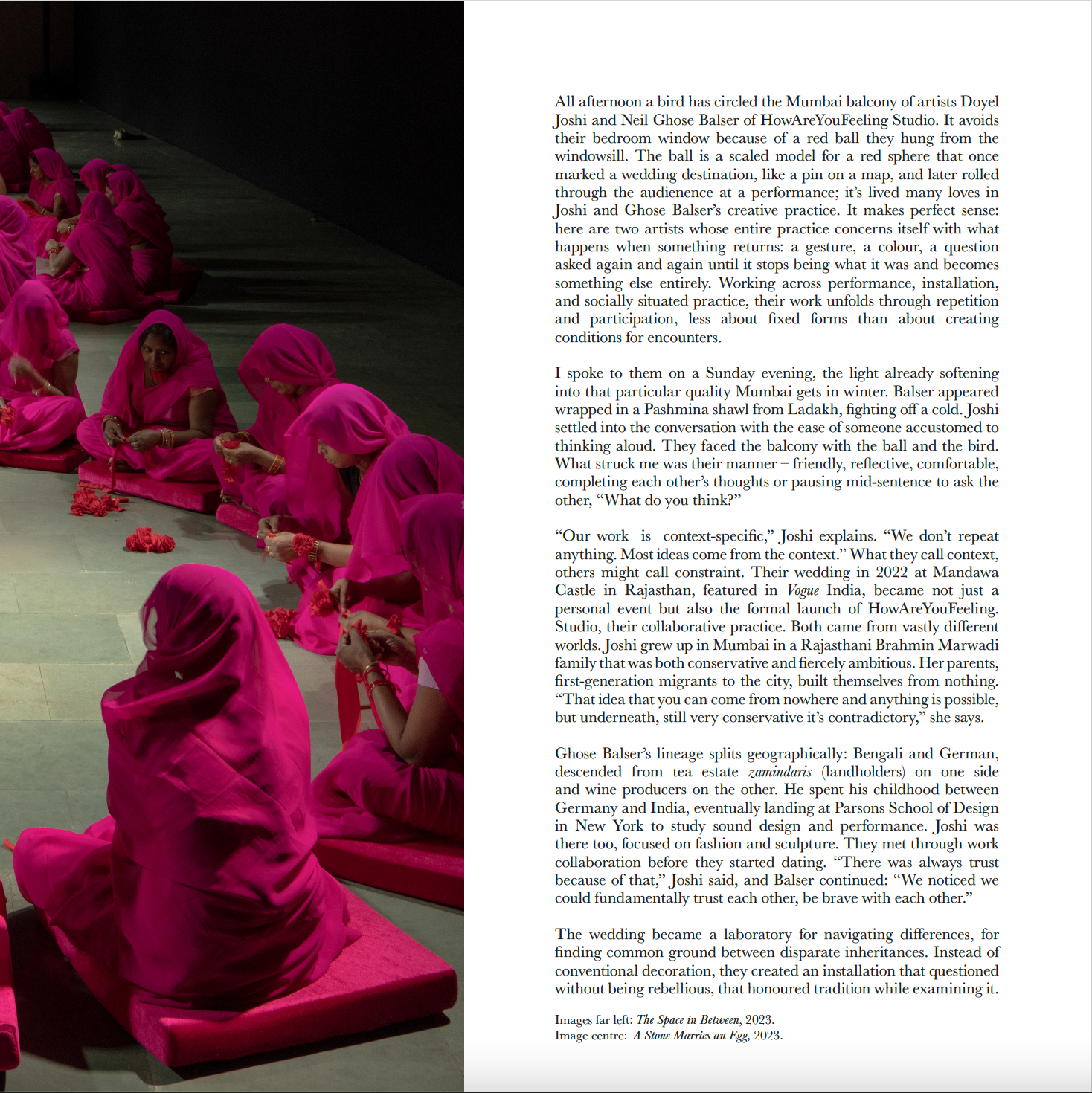In this issue, we spotlight makers from around the world who focus on the power of repeated gesture, including Dahyeon Yoo from South Korea, London-based Sayan Chanda and Richard McVetis, alongside the duo Doyel Joshi and Neil Ghose Balser of HowAreYouFeeling Studio. Together, their work embodies the Aristotelian idea that the whole is greater than the sum of its parts. The sense that an object can take on a life of its own emerges only when each gesture is given care, attention, and intention, allowing synergy to arise.