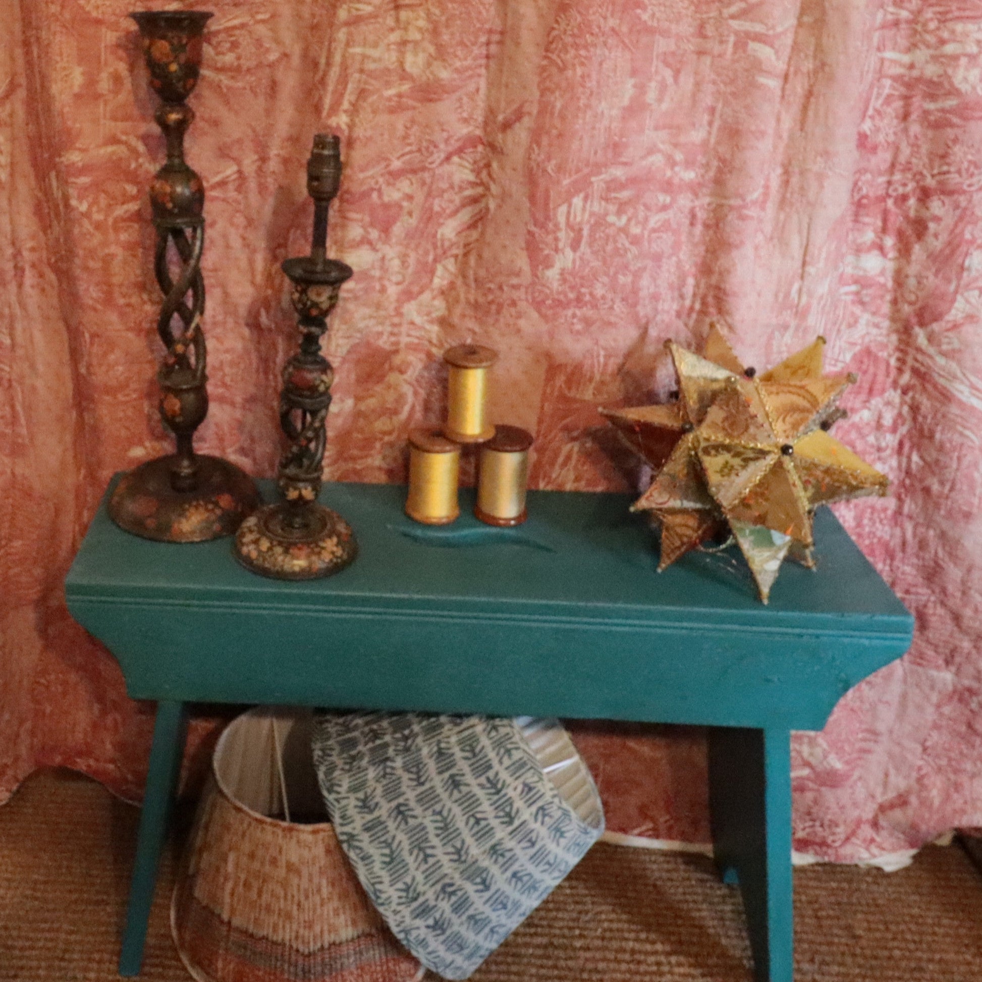 Julia also sells related antiques, such as sewing tools, boxes, ephemera, and antique Kashmiri candlesticks converted into lamps to complement the shades. Many of her treasures are one offs.
