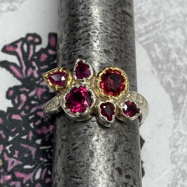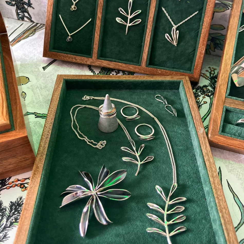 Interdisciplinary jewellery artist focusing on visual problem solving and aesthetic experimentation through metal, ink drawing, botanical drawing, digital drawing, embroidery, printing, silver and gold jewellery metal work and stone setting design.