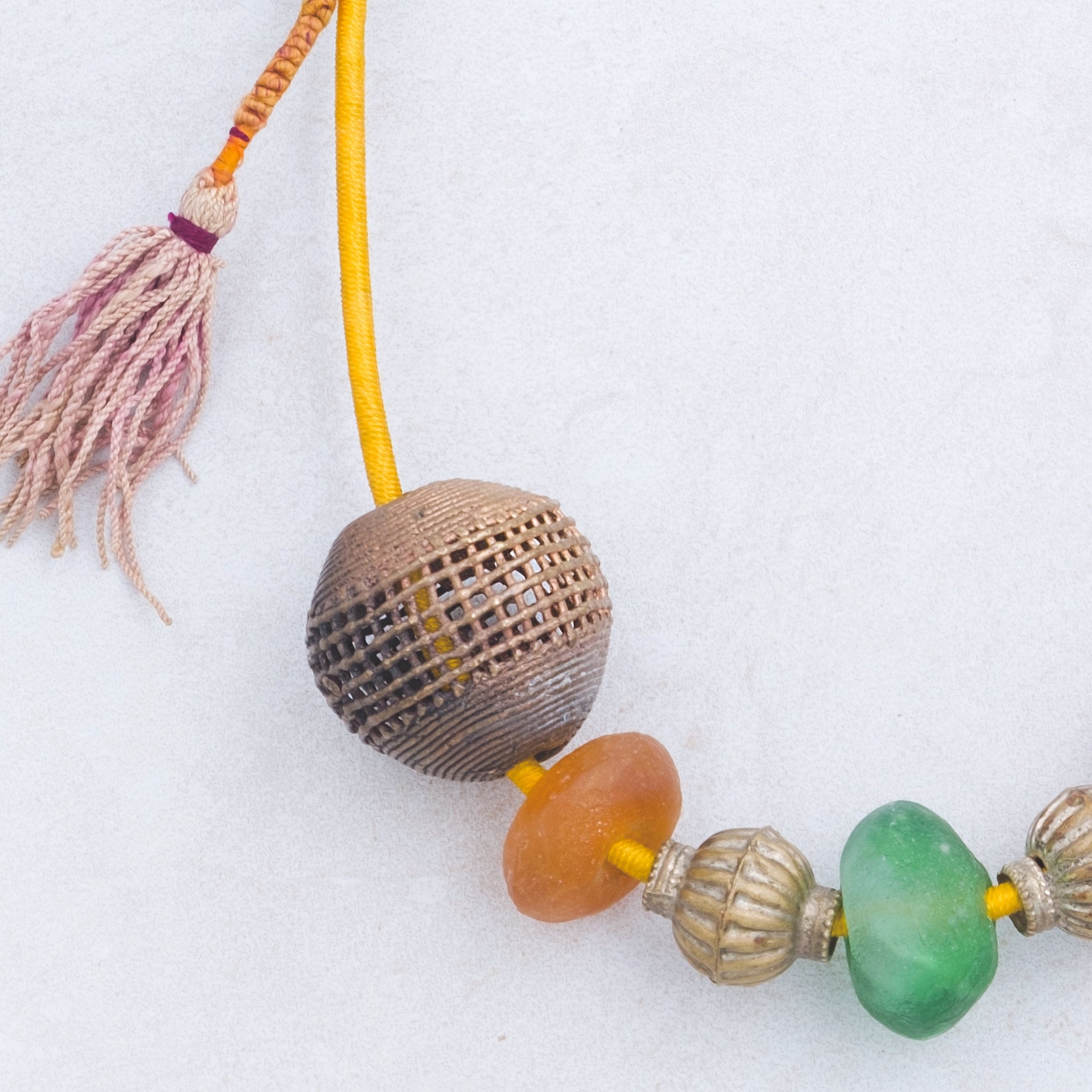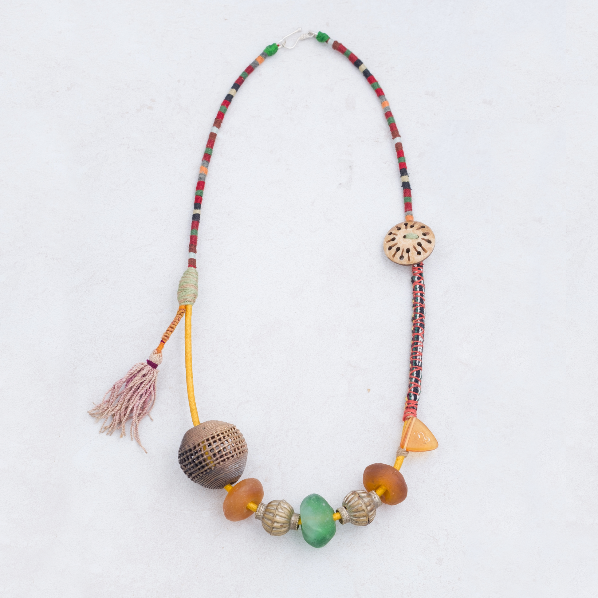 This necklace brings together a curated selection of materials collected from different cultures and traditions. Each bead, thread, and pendant is chosen for its history and texture, creating a composition that feels both timeless and contemporary.