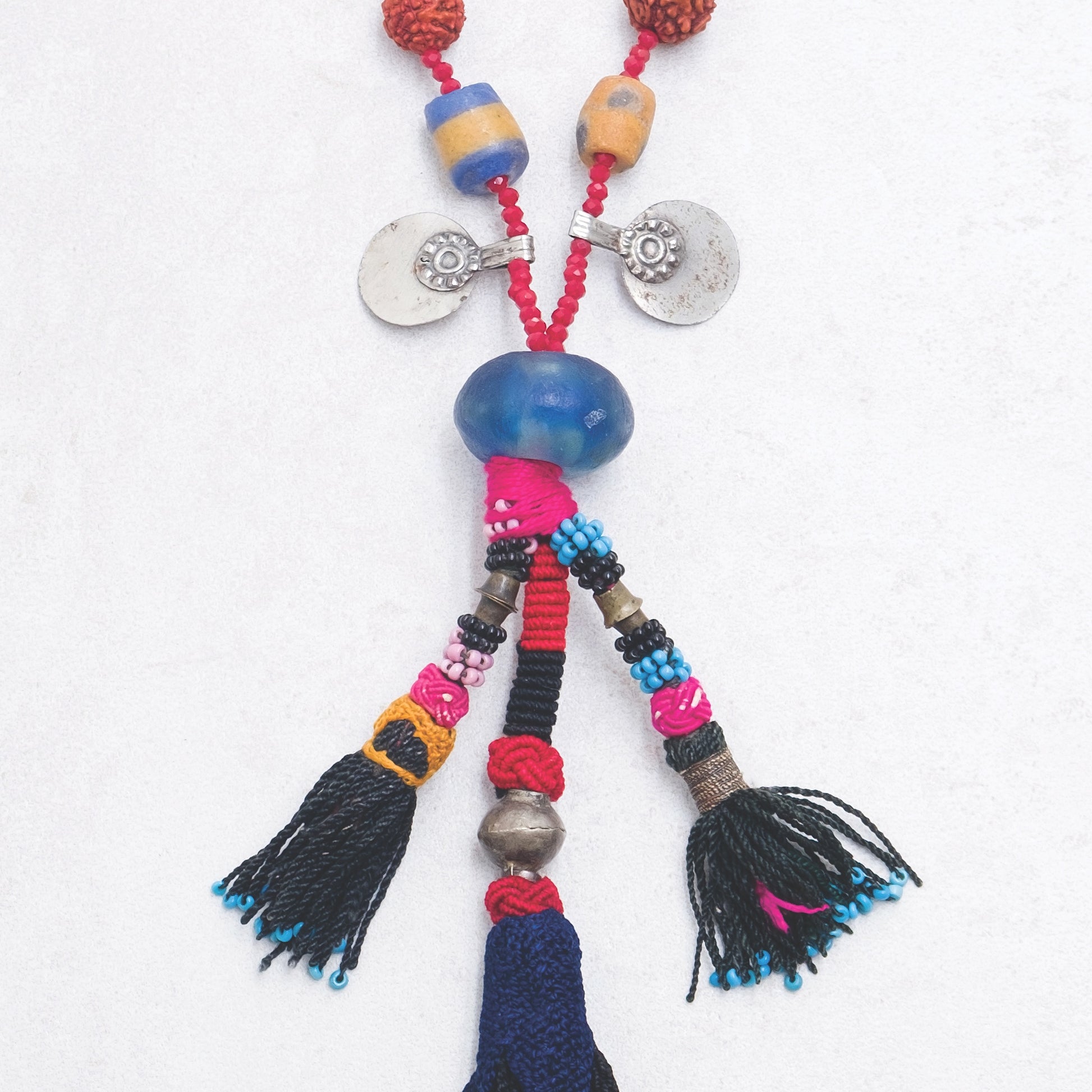 This necklace brings together a curated selection of materials collected from different cultures and traditions. Each bead, thread, and pendant is chosen for its history and texture, creating a composition that feels both timeless and contemporary.