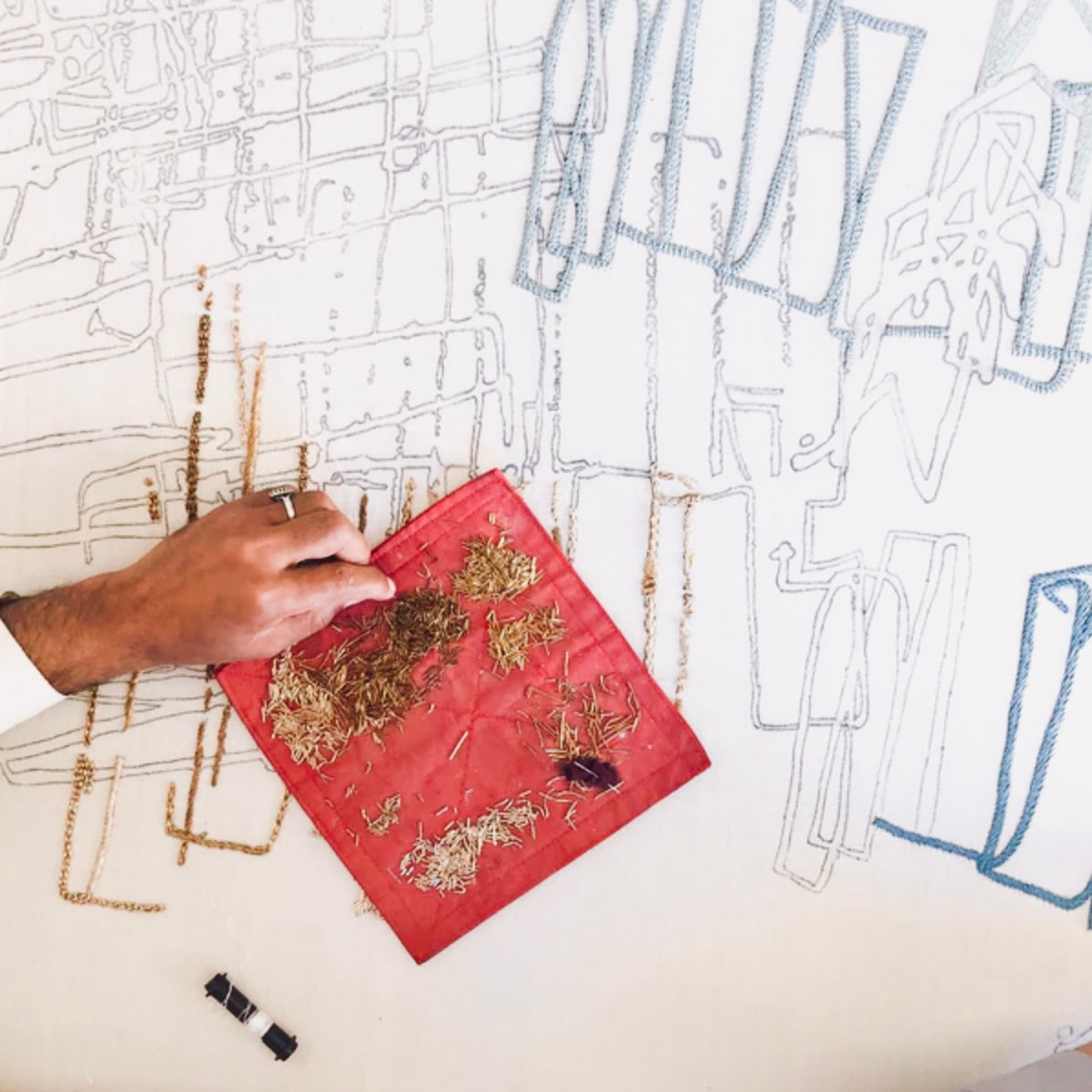 The textile pieces that will be showcased in this exhibition began with a shared act of drawing: eyes closed, pencils moving across paper without direction or authorship.