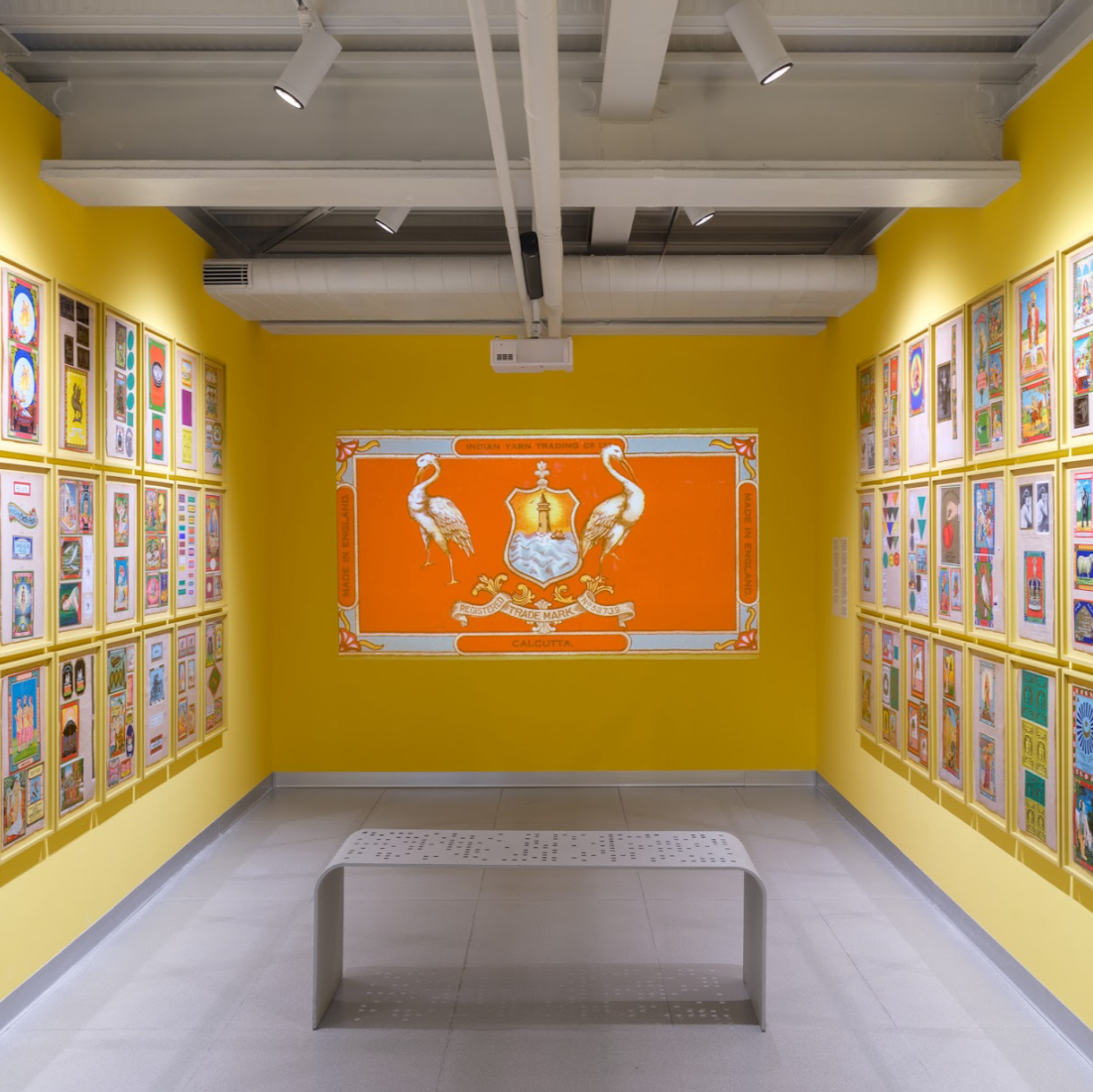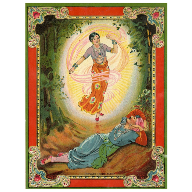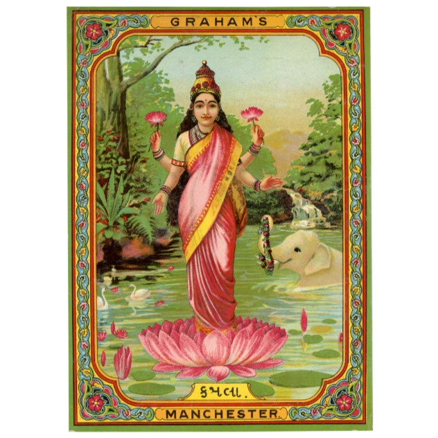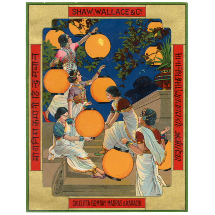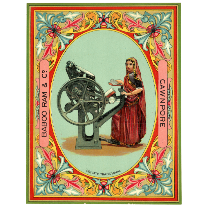 Step into a bustling Indian bazaar, in the late 19th or 20th century, looking to buy cloth. As you survey the range of fabric available, a detail catches your eye – a glossy, multicoloured paper label affixed to nearly every length of cloth. Each label has a different image: a dancing elephant that makes you laugh, a familiar deity that invites devotion, a woman reclining in a lush garden that stirs longing, or a steamship that inspires dreams of distant shores.