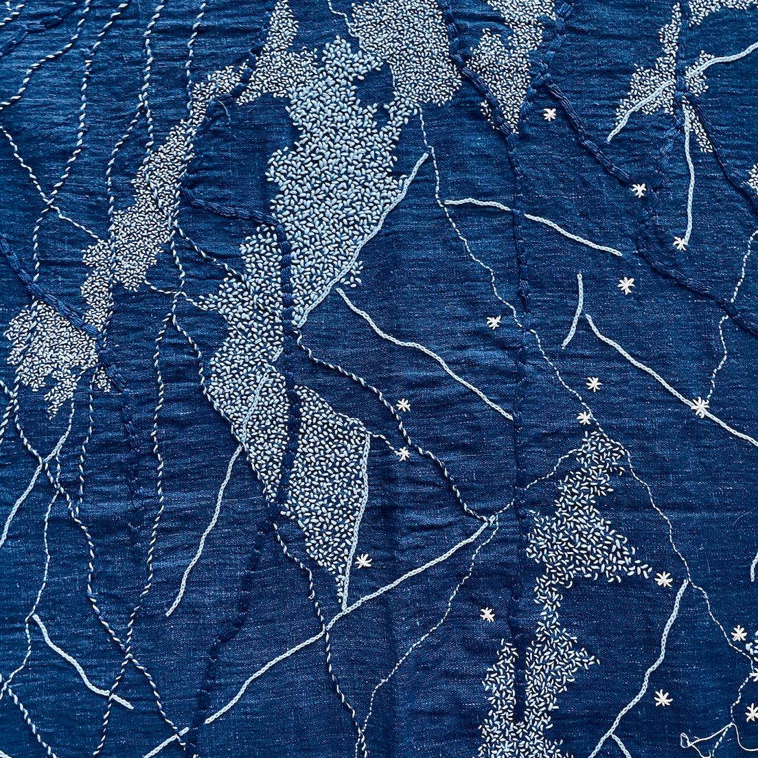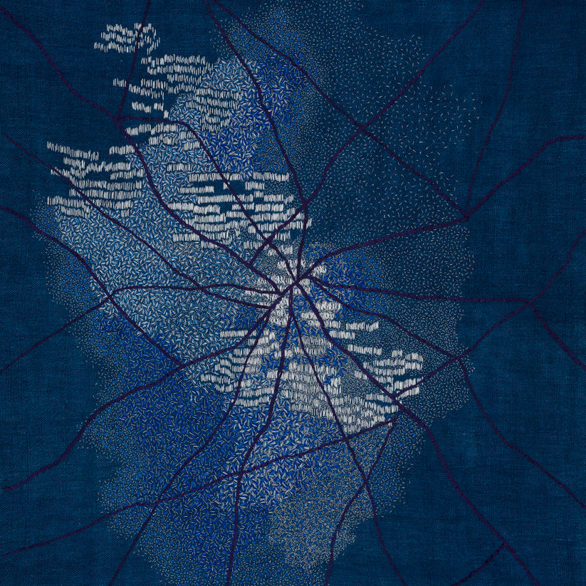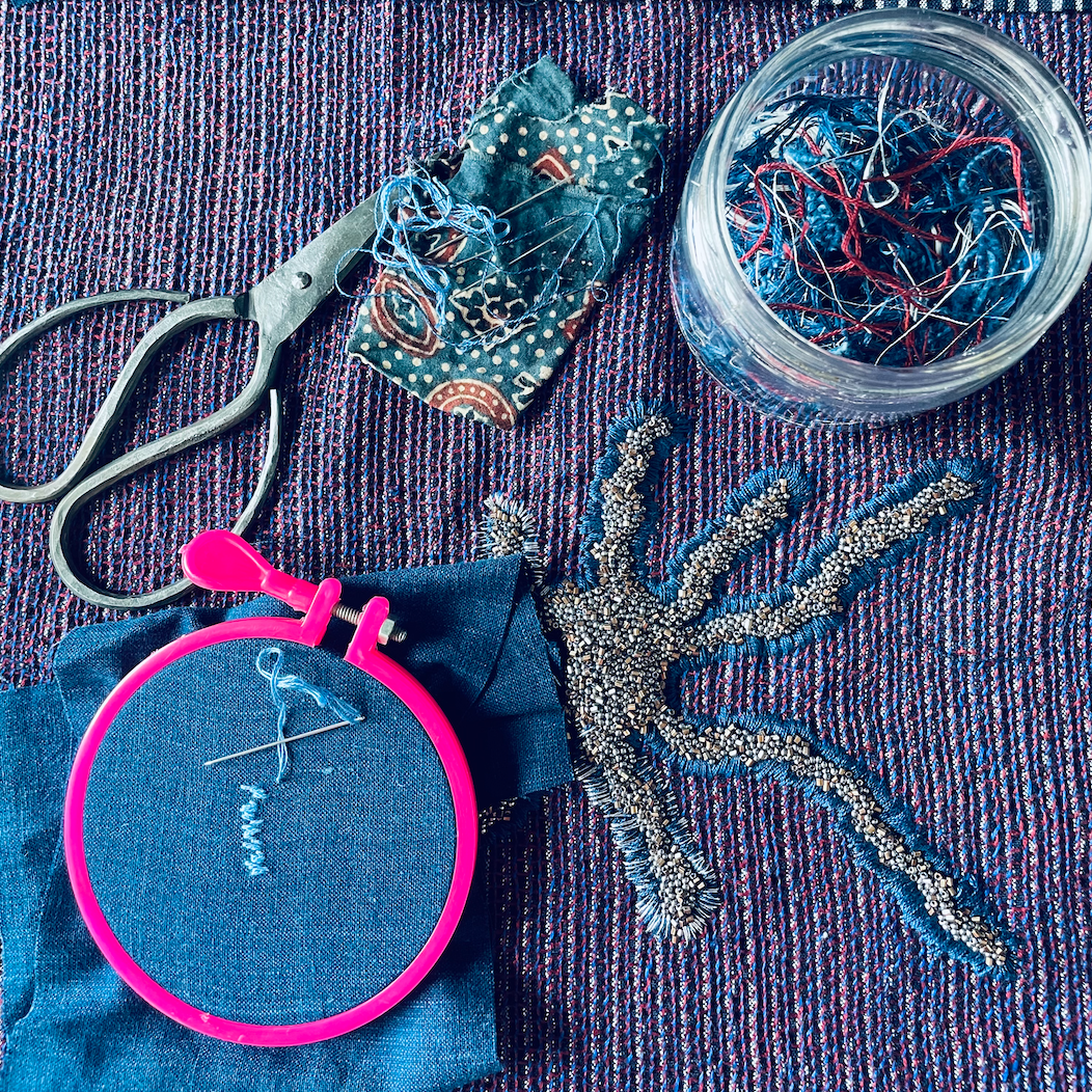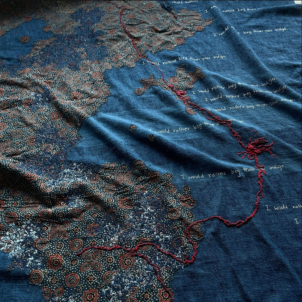 Hansika Sharma is a textile artist whose central concerns are the colour indigo, complexity of embroidered surfaces, transformation and is informed by the philosophy of self reflection.