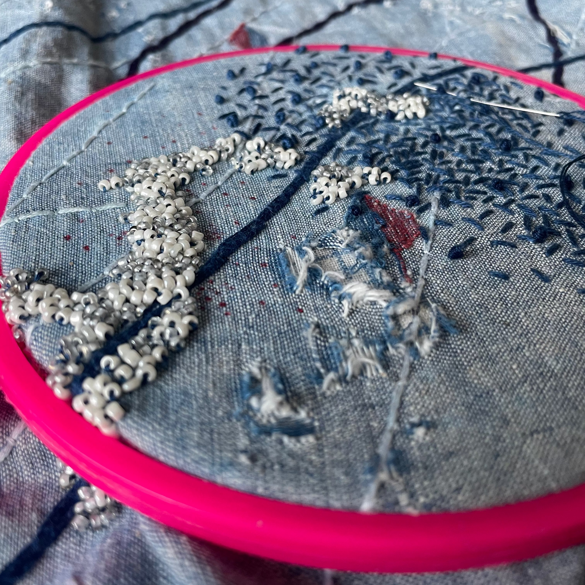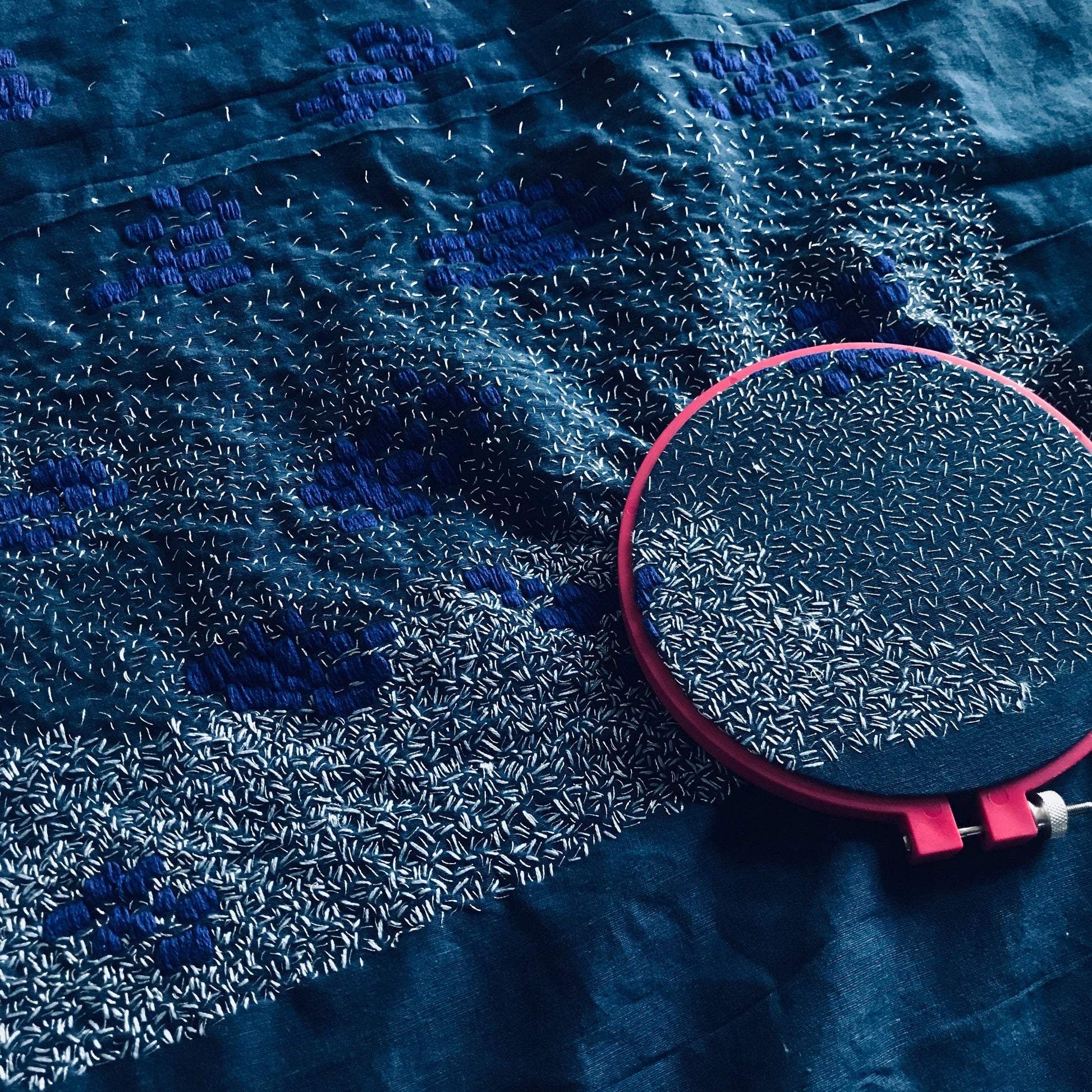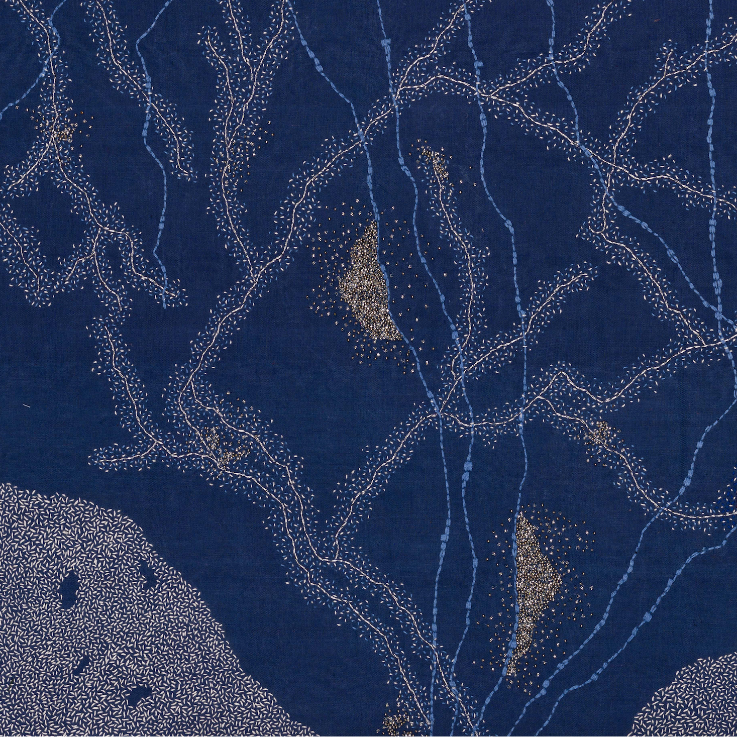 Hansika Sharma is a textile artist whose central concerns are the colour indigo, complexity of embroidered surfaces, transformation and is informed by the philosophy of self reflection.