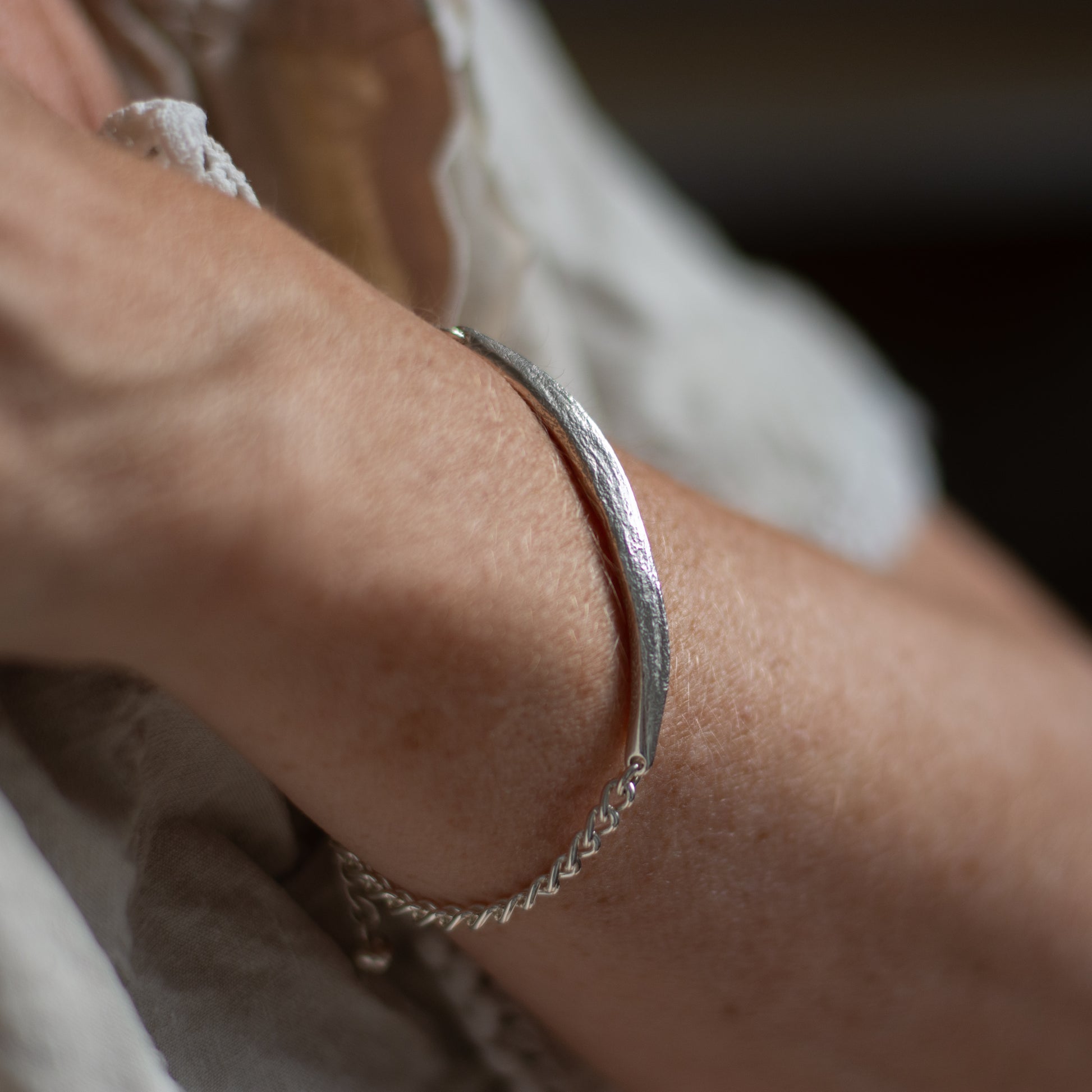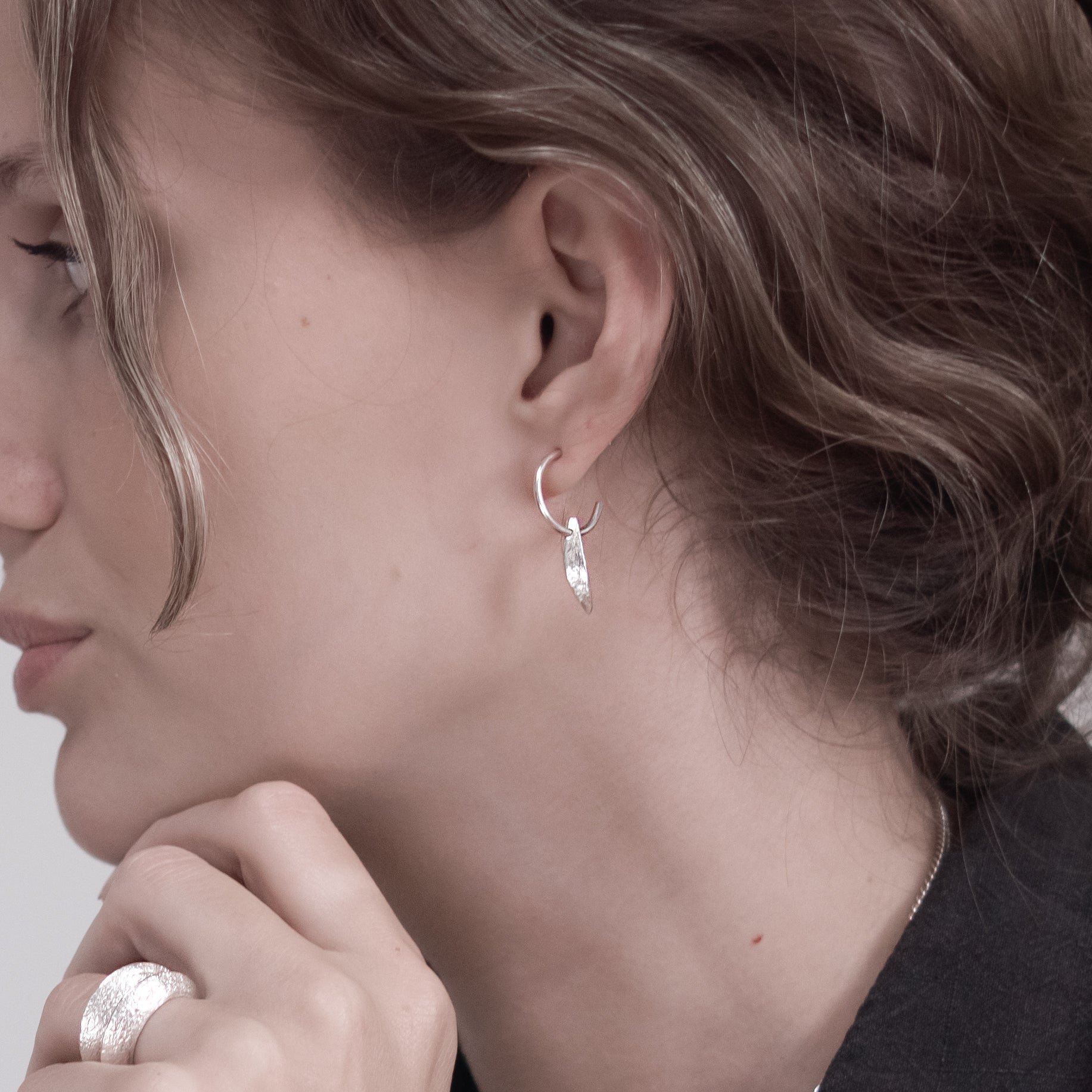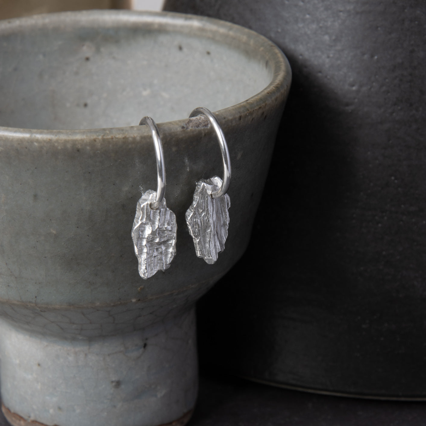 Sally uses traditional tools and techniques to form and forge her jewellery from recycled silver, and works with a local caster for pieces made by the lost wax casting method, sculpting the wax by hand for each design herself.