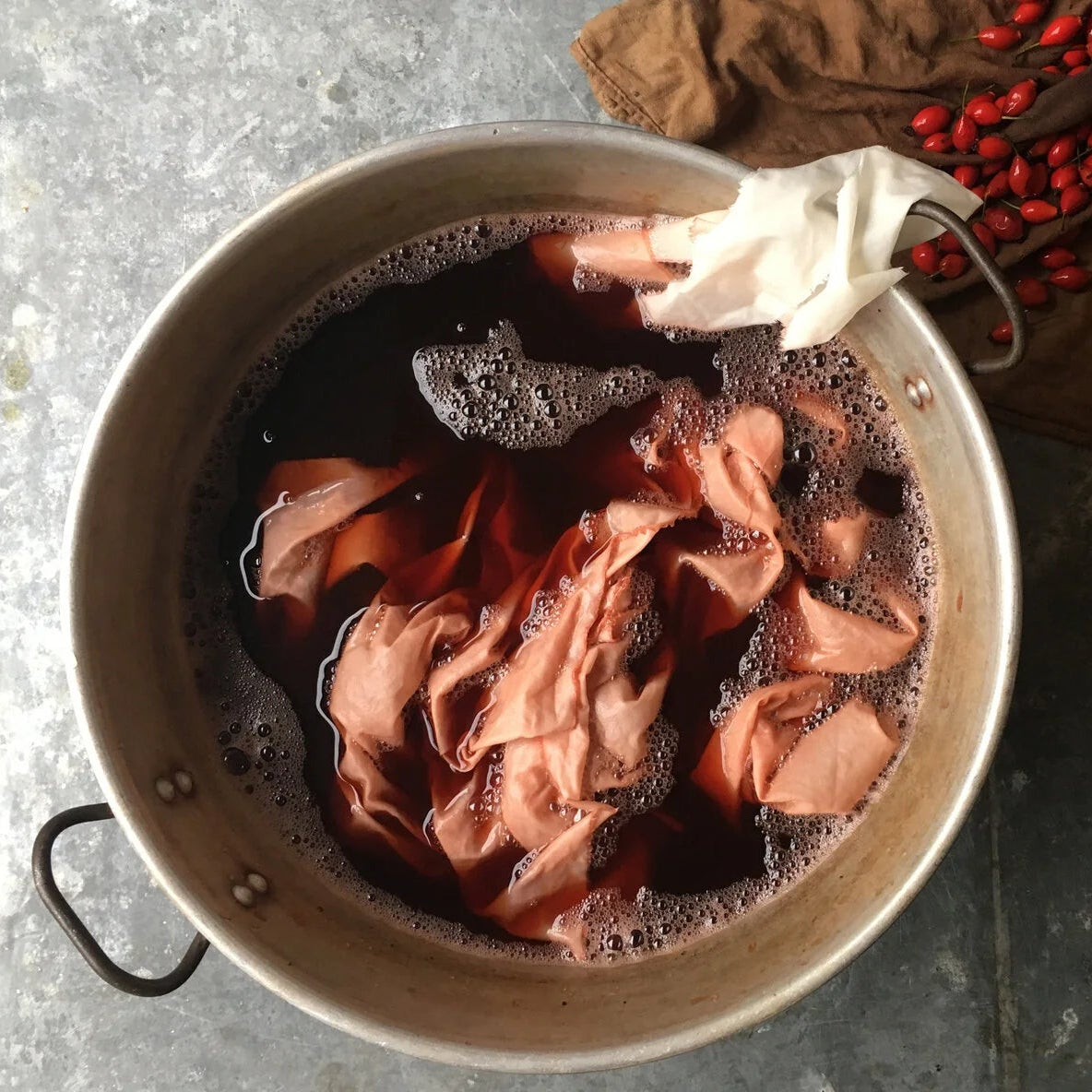 We work exclusively with natural fibres including linen, silk, wool and bamboo, crafting an ever evolving palette of colours through the use of petals, leaves, bark, roots & seeds. Ingredients are foraged in the Kent countryside, grown on our dye allotment or are sourced from food waste collected from local cafes. Sometimes our dyes come in powdered form from responsible GOTs certified companies.