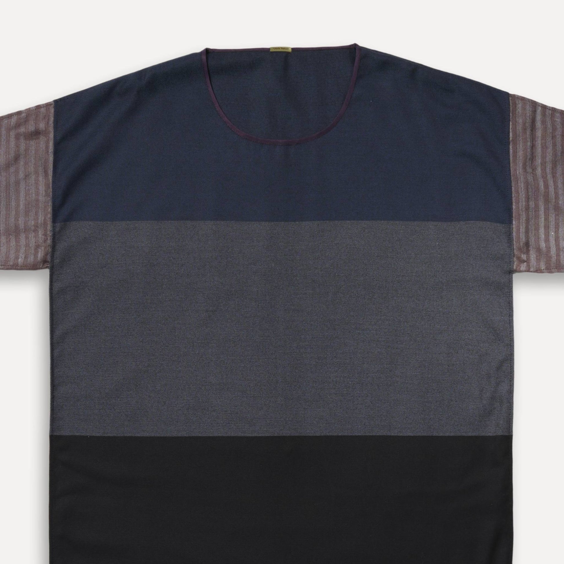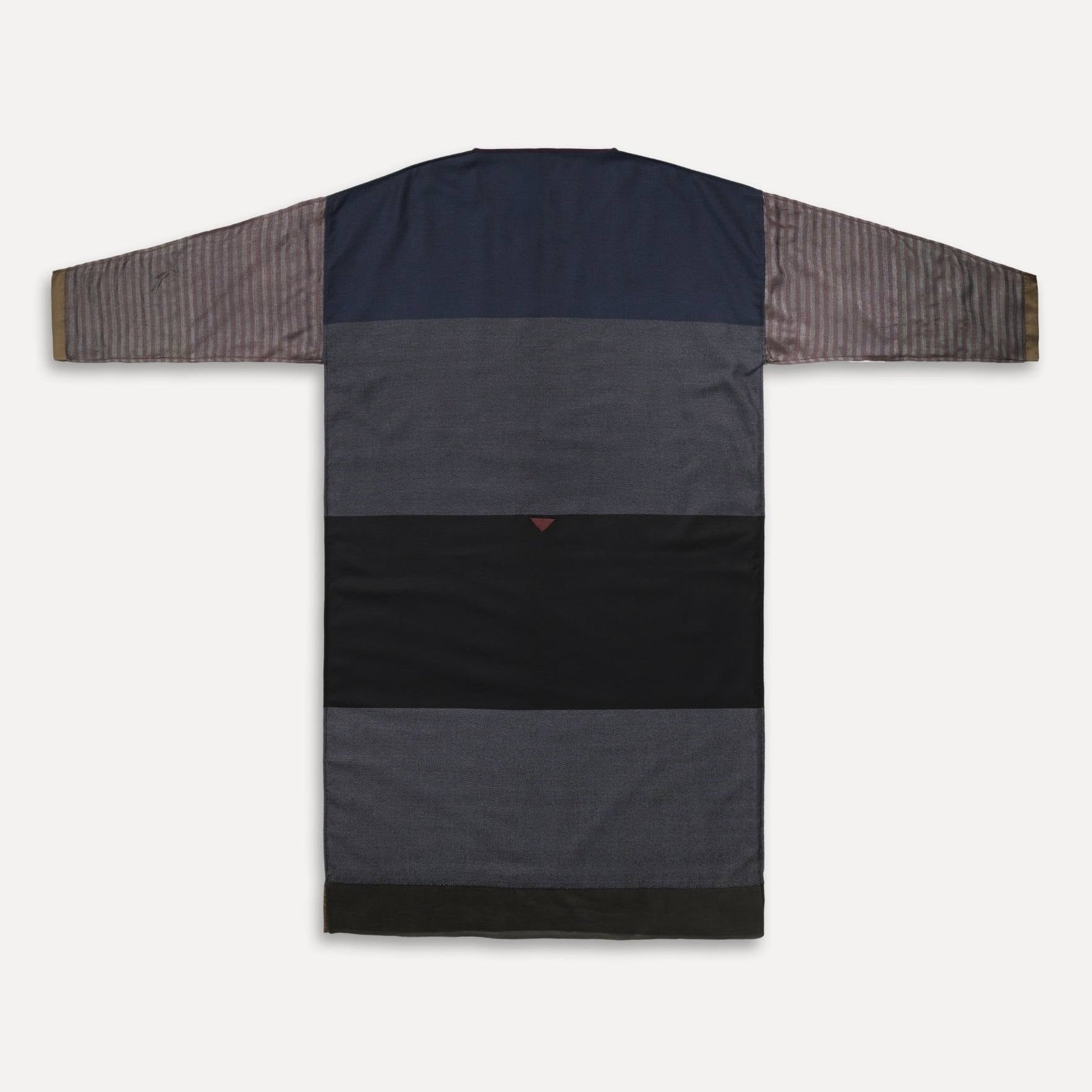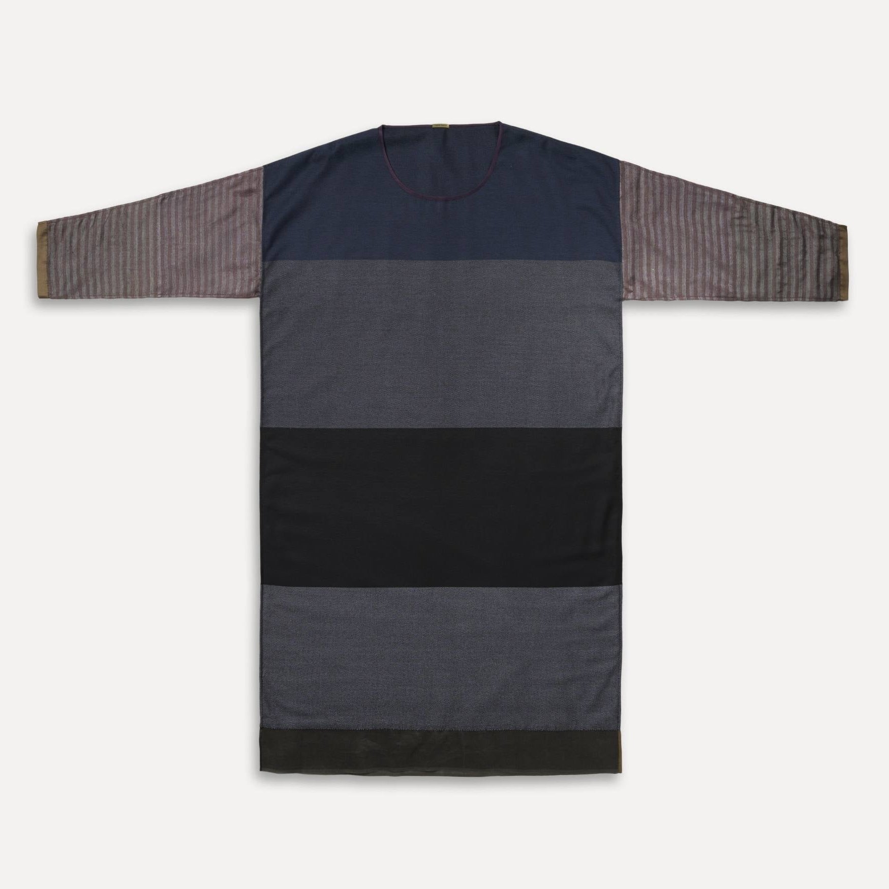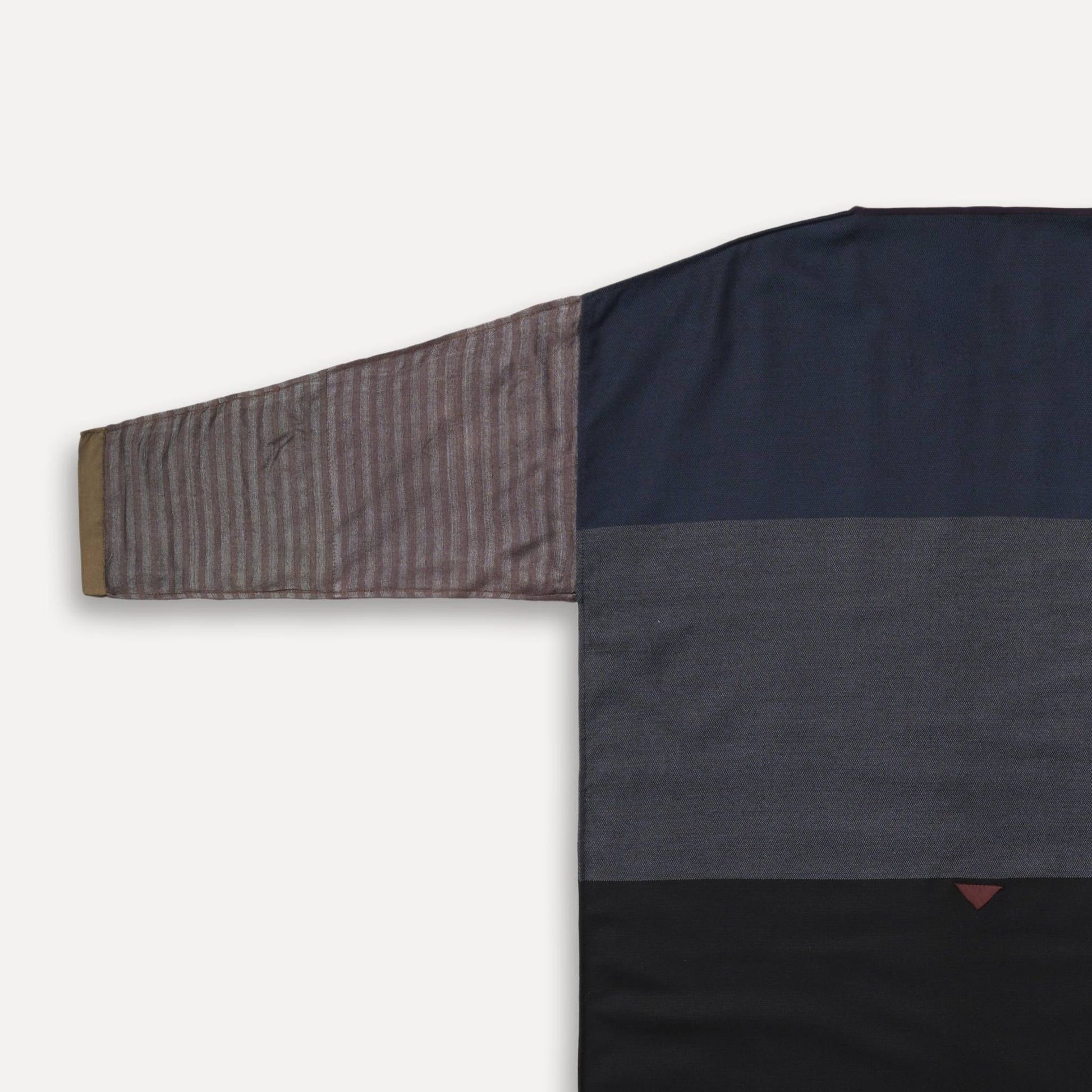 The silhouette is clean and relaxed, allowing the horizontal bands to define the form. Striped silk sleeves add contrast and refinement, while the silk taffeta hem provides a subtle architectural finish. Entirely hand-stitched, the garment reflects a meticulous and time-intensive making process rooted in artisanal practice.