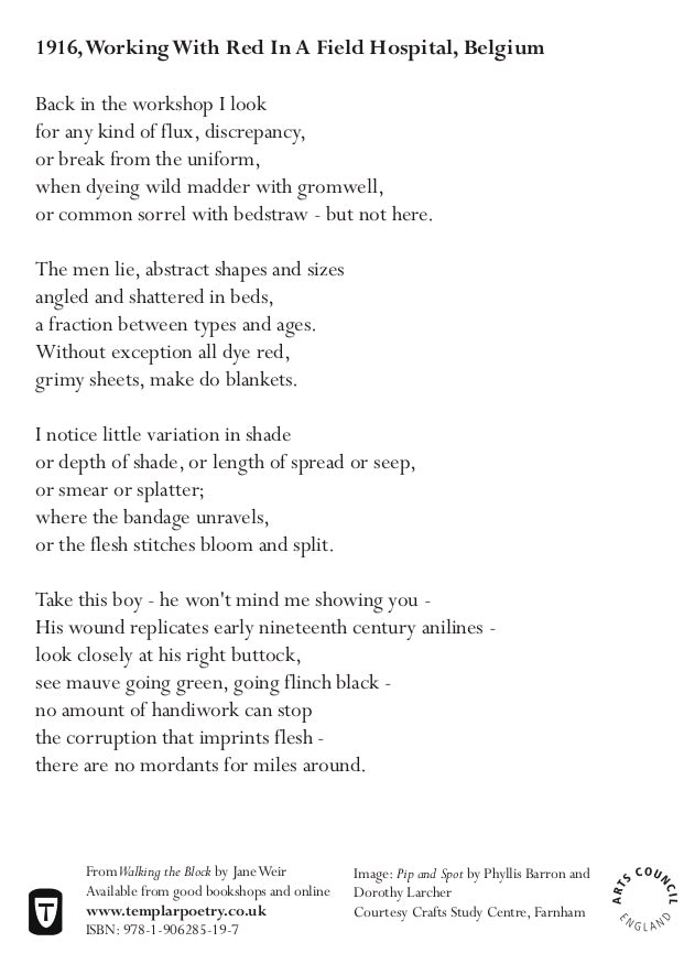 Jane Weir (b. 1963) is an Anglo‑Italian writer, designer and poet whose work bridges craft history and lyric imagination. Winner of the Wigtown Poetry Prize and celebrated for her sensitive textual portraits, she is the author of Walking the Block (2008) and Spine (2012) — poetic biographies that explore textile-making figures through archival empathy. A contributor to Selvedge, PN Review and Faber anthologies, Weir’s work is deeply rooted in material culture and language-as-structure.