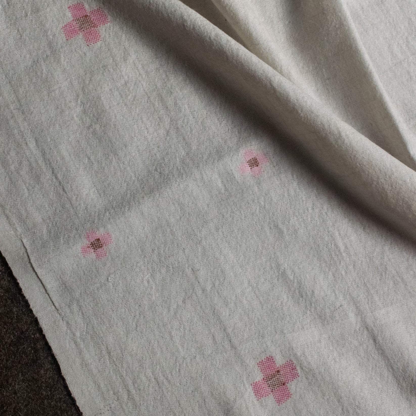 Inspired by the spring blooms that brighten Ladakh’s high-altitude landscape, the Mentok Shawl takes its name from the Ladakhi word for flower. Its delicate motifs are woven using the extra weft technique which is a first of its kind in Ladakh. Complemented by a traditional black and white warp rib stripe along the border, the shawl echoes the Challi patterns found in the region’s handwoven home textiles.