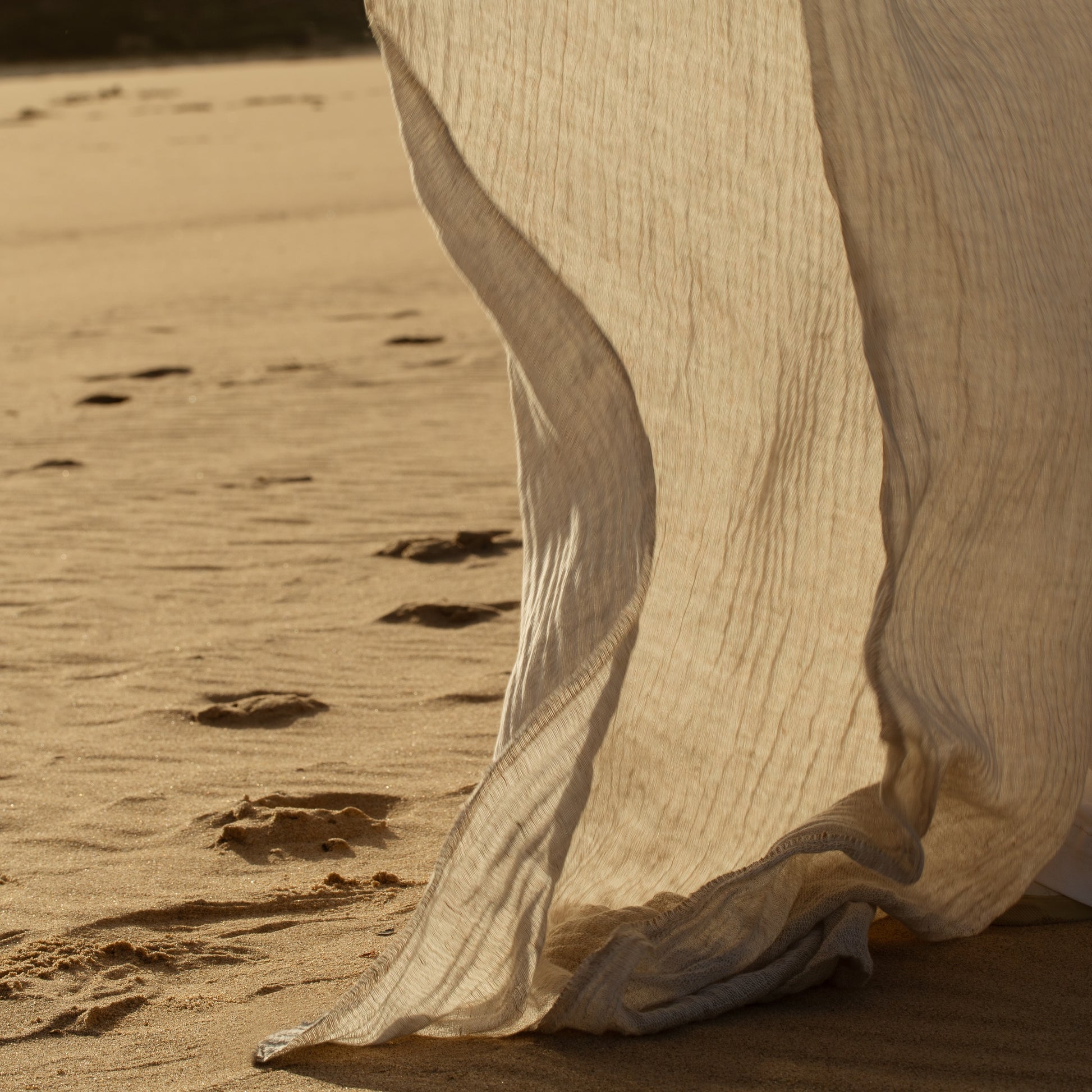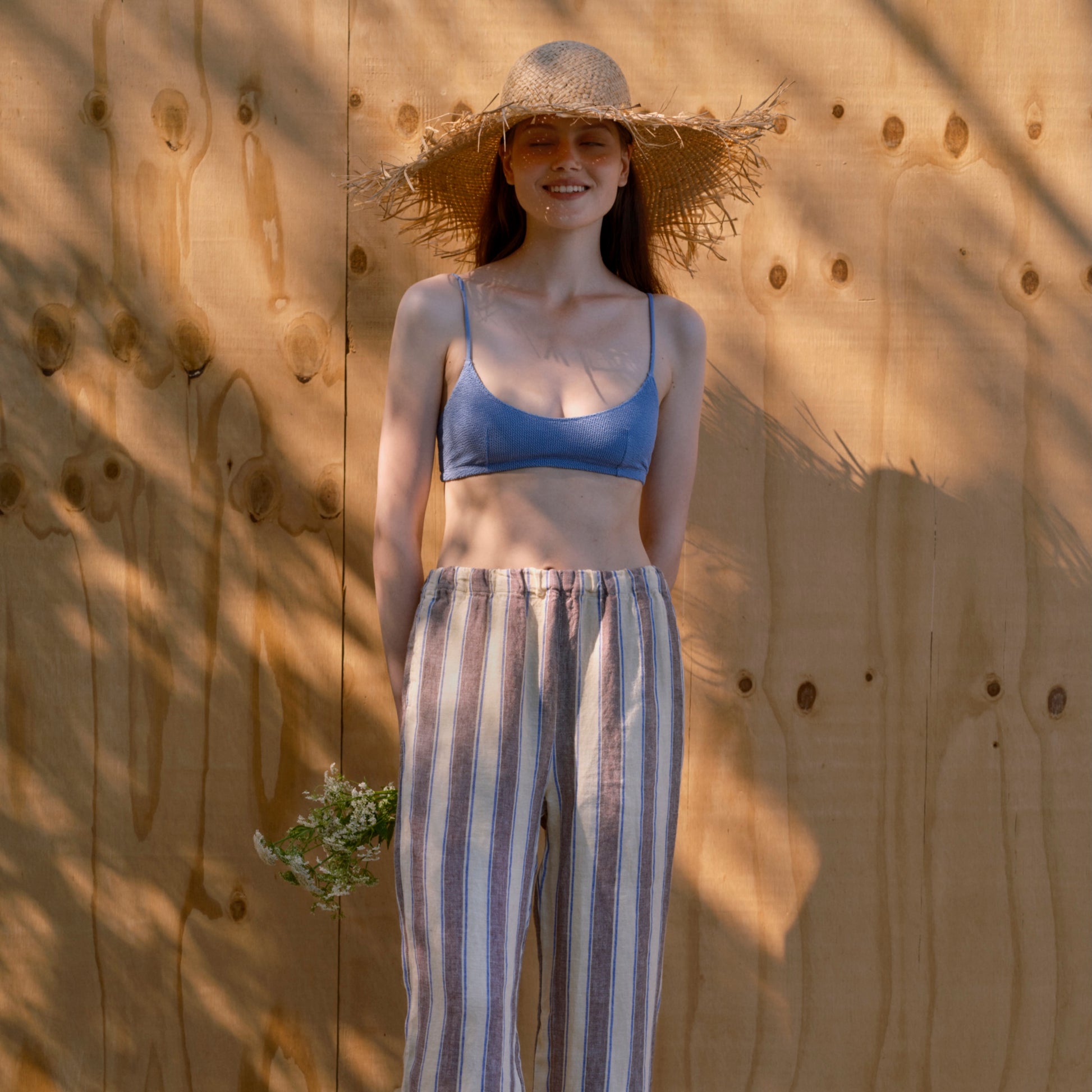 This curated gift set features a linen collection designed for comfort and relaxation. Linen is absorbent, lightweight, and the perfect companion for spa and sauna rituals. The set includes a linen bathrobe, a lightweight bath-and-hand-towel set in a Tencel-linen-cotton blend, a pair of linen slippers, and linen lounge pants in ivory-blue-brown stripe, available in your choice of size.